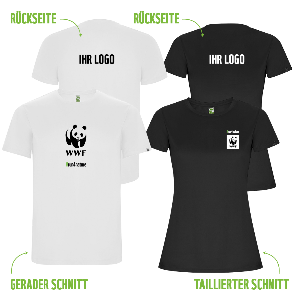 Alle WWF Laufshirts werden nach strengen Umweltstandards, fairtrade und vegan hergestellt und es erfolgt ein individueller Firmenlogo-Druck auf der Rückseite. Es kann auch ein Firmenlogo und darunter ein Claim (Lauf-Spruch) stehend in einer Datei – als ein Gesamt-Bild – dargestellt übermittelt werden.